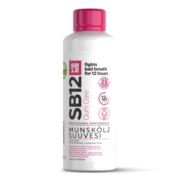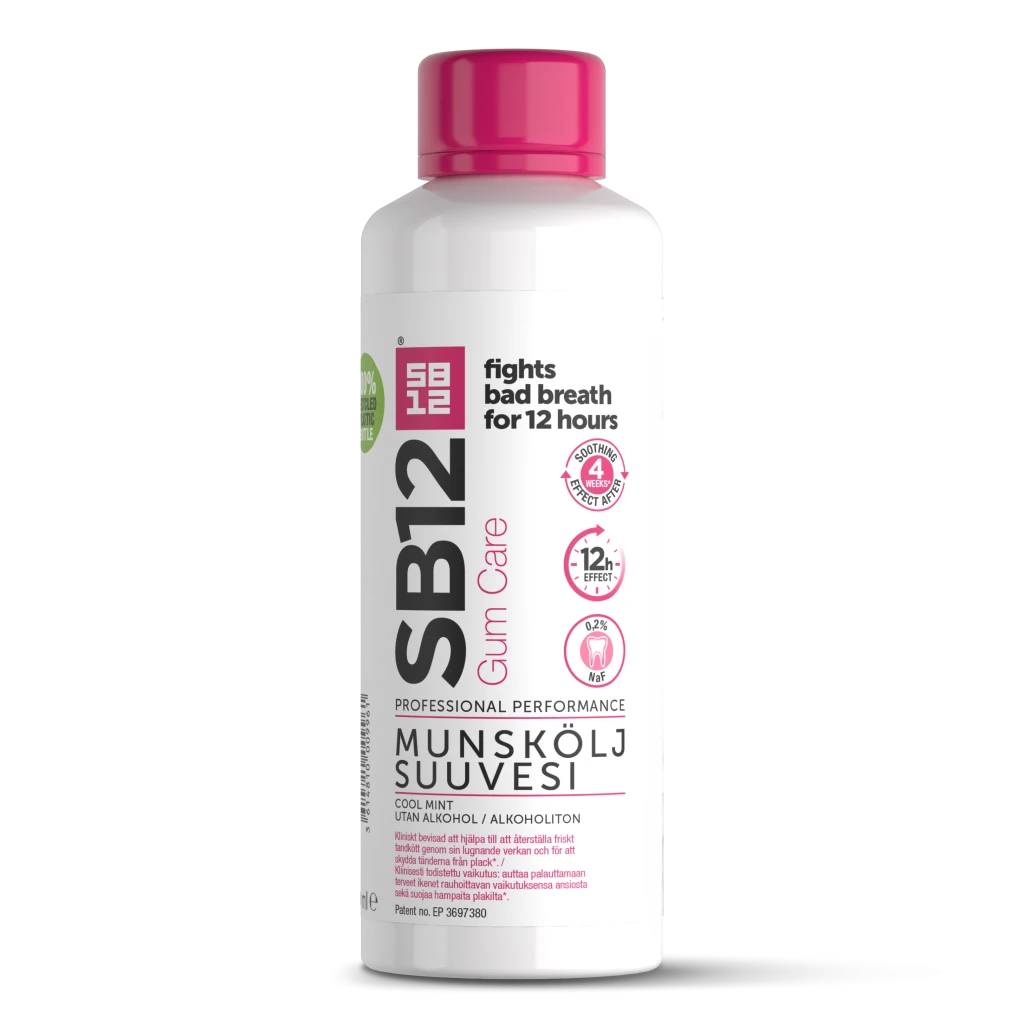 500 mlSB12 Gum Care on 4-in-1-suuvesi suuvesi, joka torjuu pahanhajuista hengitystä, ehkäisee reikiintymistä, vahvistaa hampaita ja rauhoittaa herkkiä ikeniä.