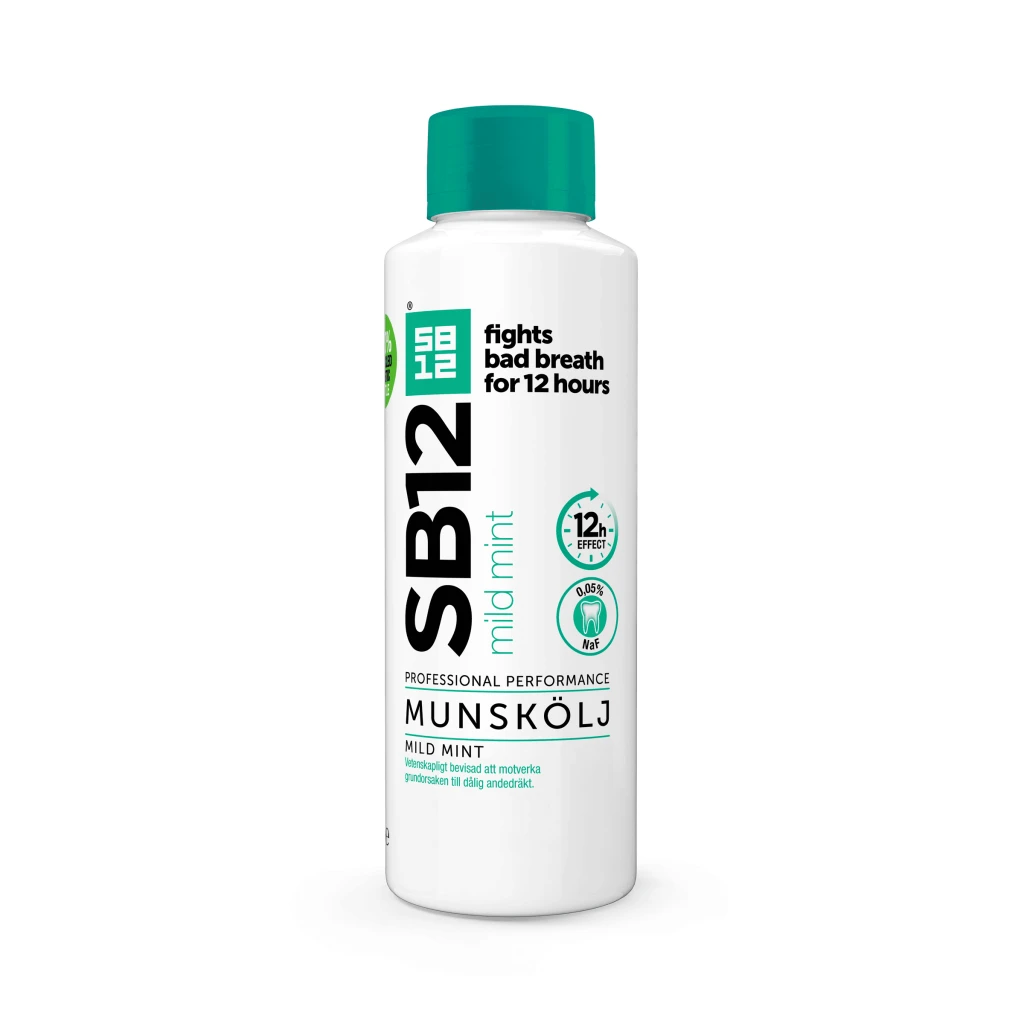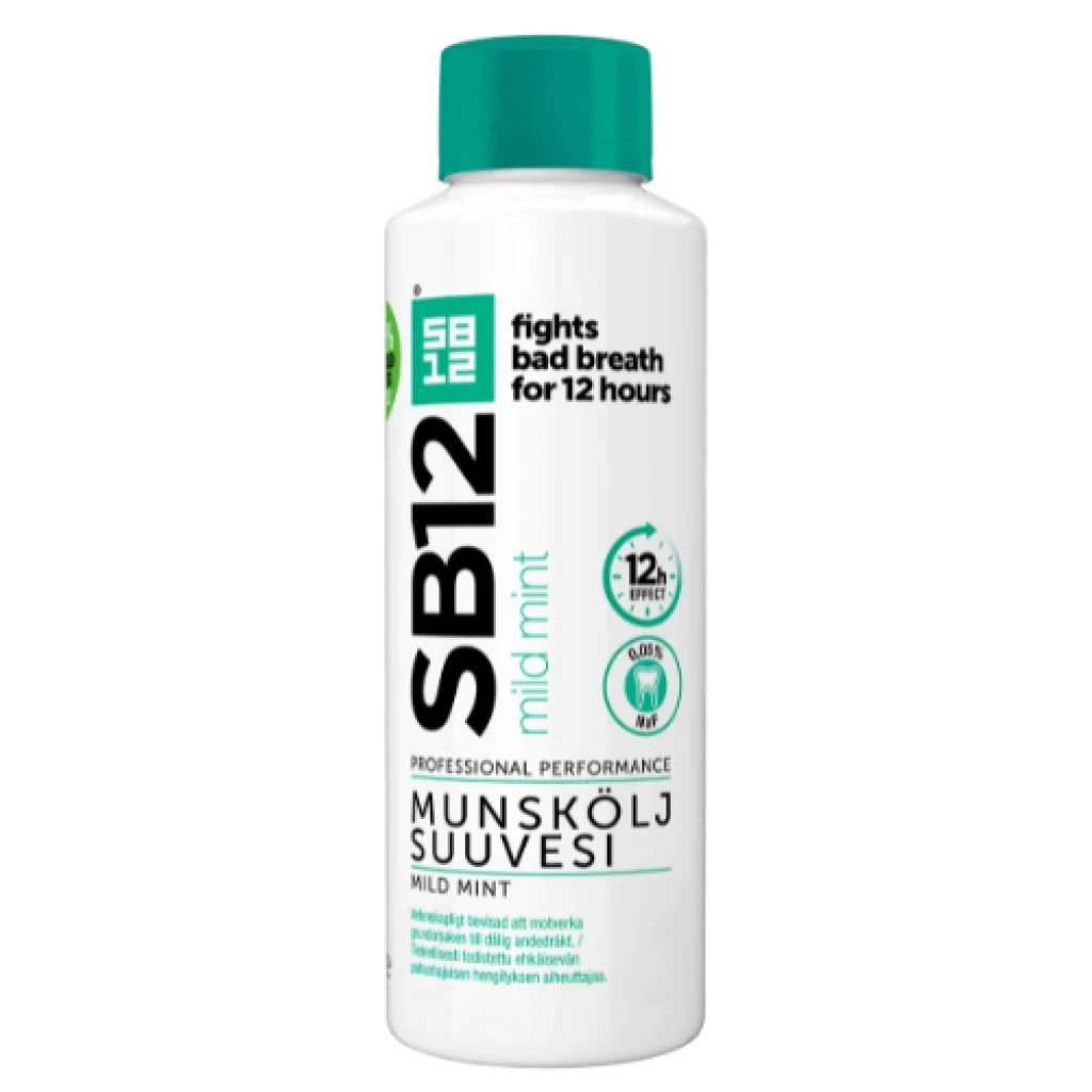 SB12 Mild Mint suuvedessä on raikas, miedompi mintun maku verrattuna muihin SB12-suuvesiin, mutta sillä on sama todistettu 12 tunnin teho pahanhajuisen hengityksen perimmäisen syyn torjumiseksi.